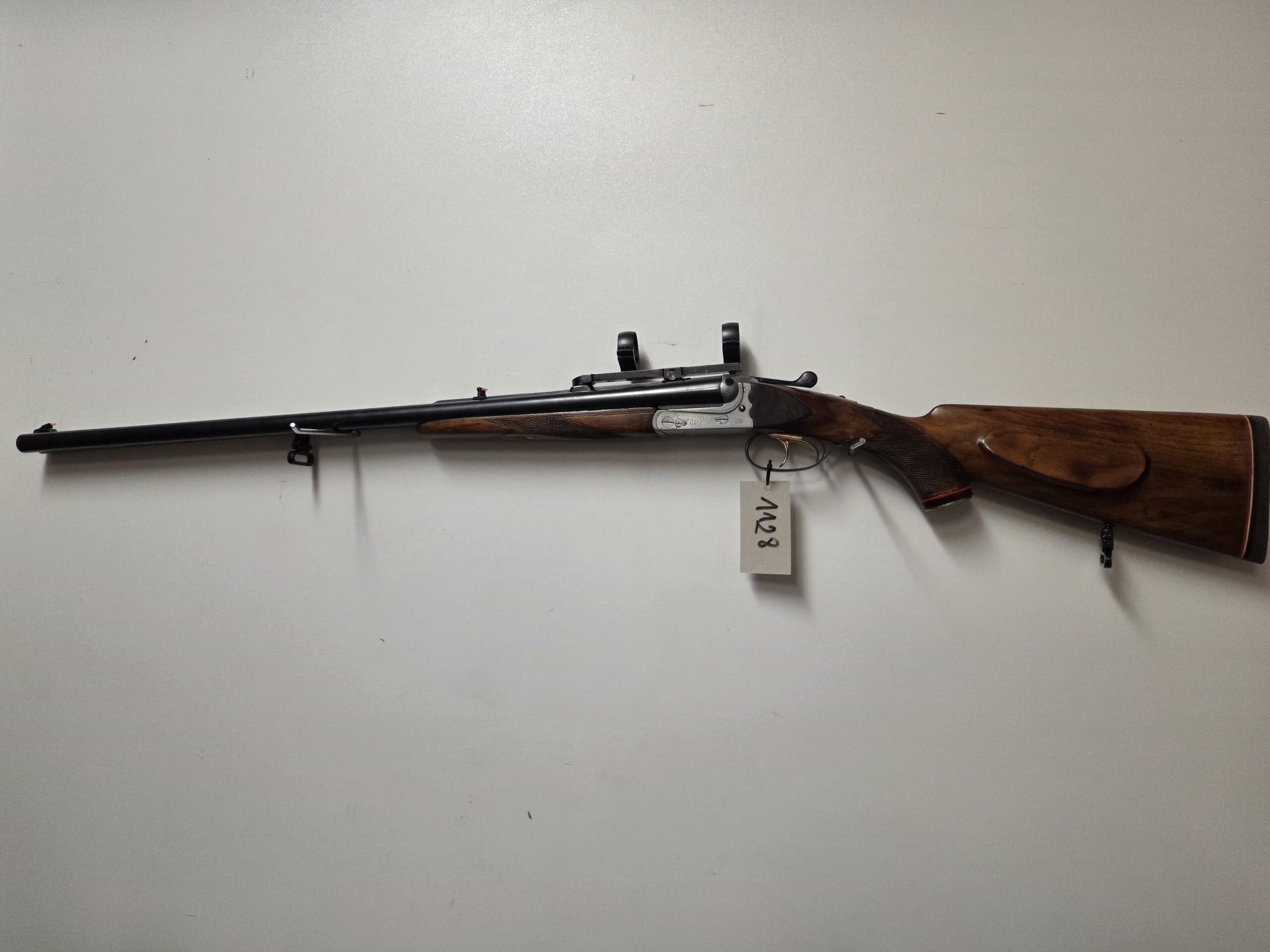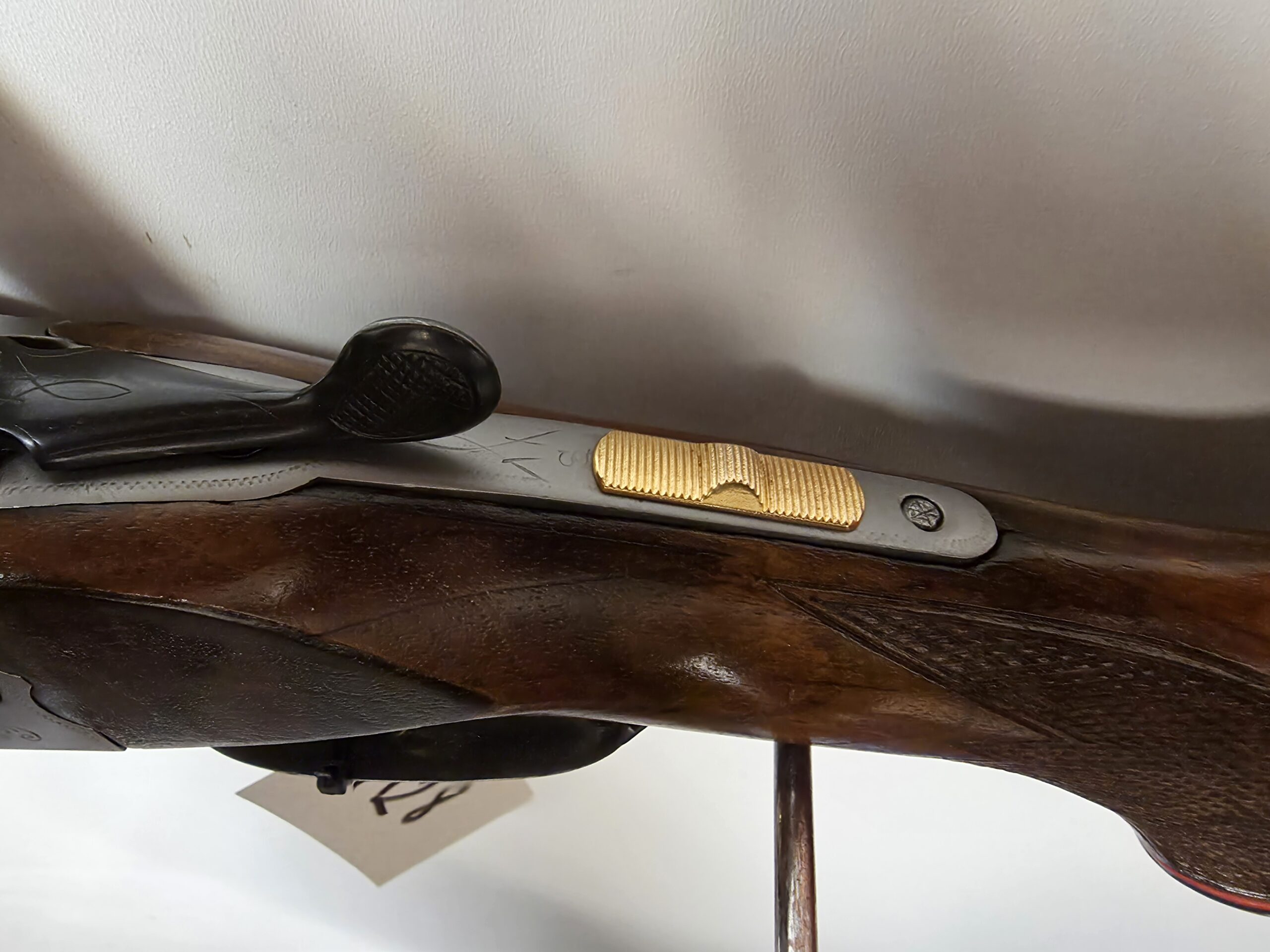 Horyzontalna kniejówka wykonana przez Rusznikarza Laskowskiego, na bazie dubeltówki Merkel. Lufy bardzo dobrze zgrane. Broń posiada pozłacane zdobienia oraz montaż pod lunetę 30mm.