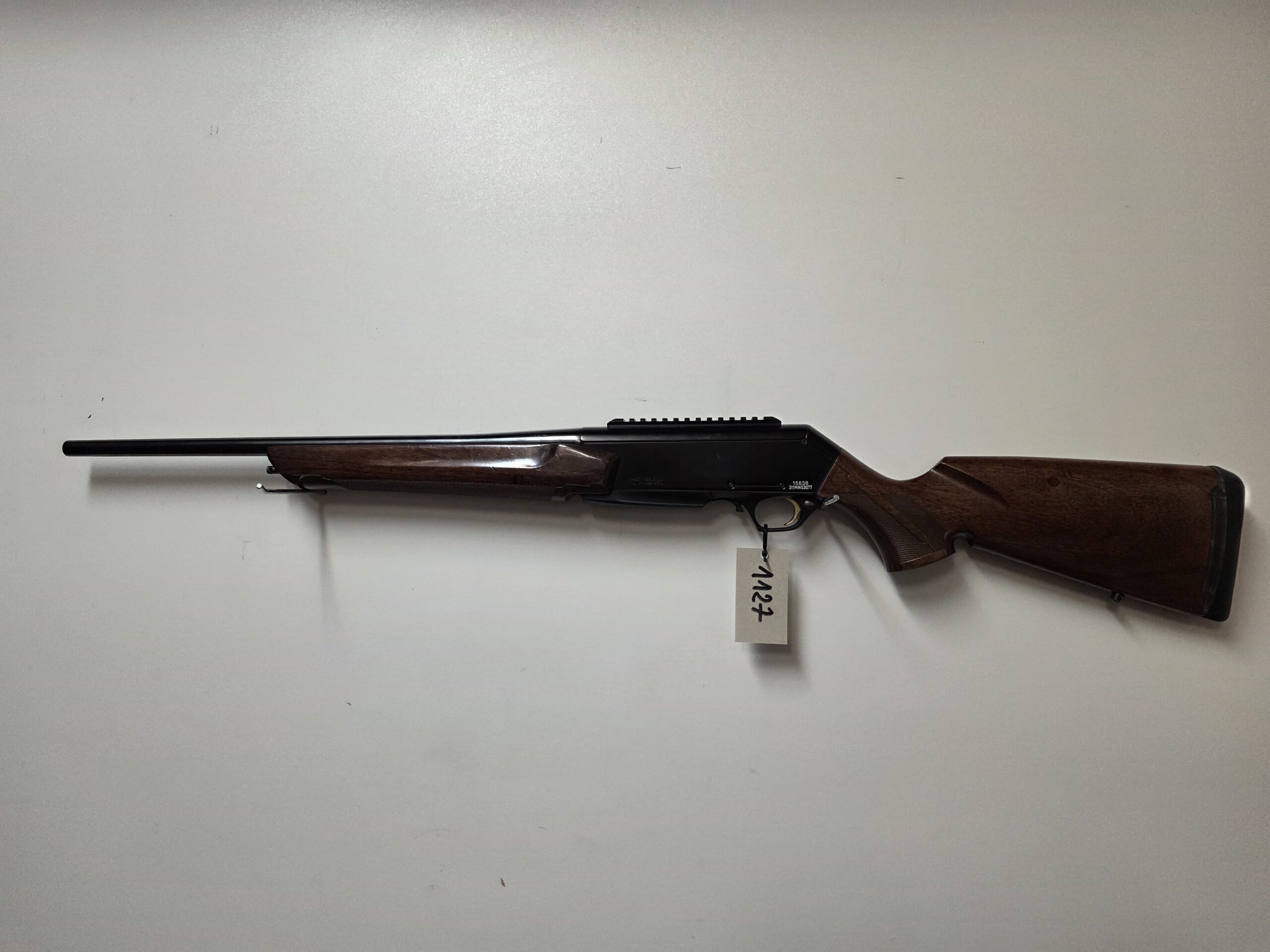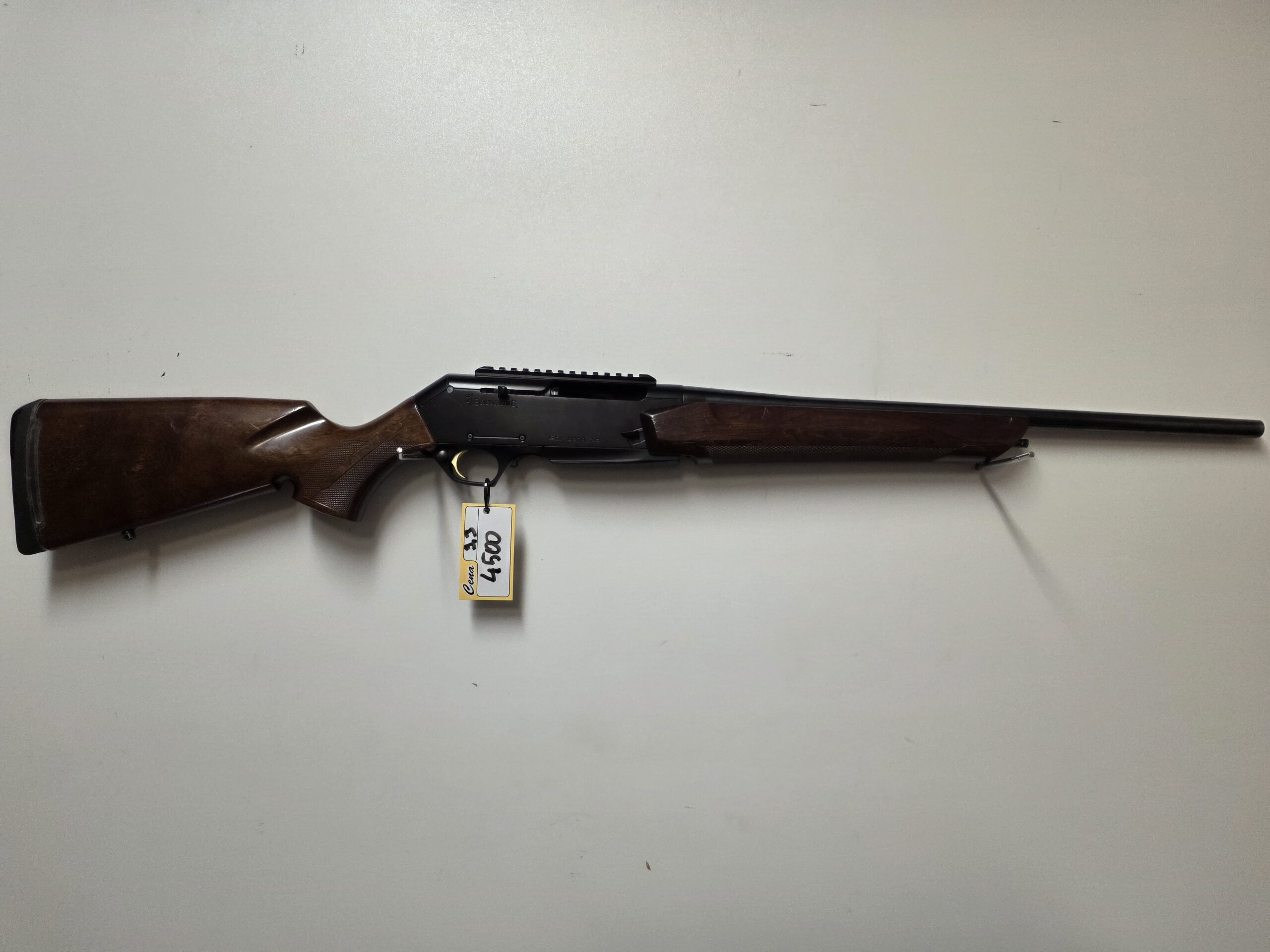 Belgijski półautomat kulowy w kalibrze 9,3×62. Brak otwartych przyrządów celowniczych.Osada drewniana,broń posiada wyjmowany magazynek. Zamontowana szyna weaver.